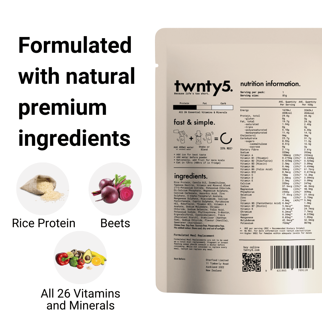 Twnty5 provides balanced macronutrients (proteins, fats, carbs, fibre) and all 26 essential micronutrients to fuel your body like a regular meal.