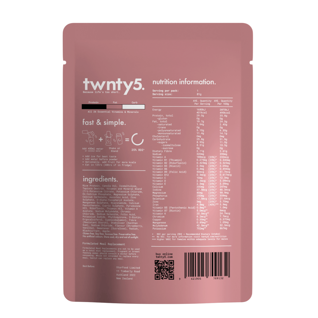 Because each Twnty5 meal contains 25% RDI (Recommended Dietary Intake) of all the 26 essential nutrients we need, based on Australia and New Zealand Government Health Nutrient Reference Values.